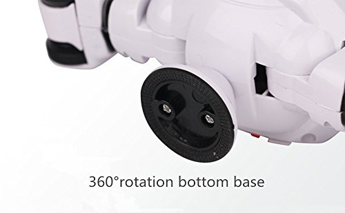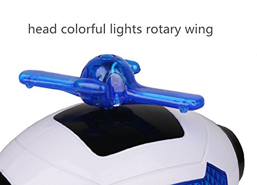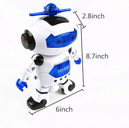 -. Feature : Small and delicate- mini size 15x7x21cm/6x2.8x8.7inch, funny toys for baby kids. / Cool and colorful light- the head, eyes and body of the robot will give out cool light and rotate to form a colorful circular, pretty beautiful. / Splendid music- the robot is inserted with wonderful music, turn on the switch, it will play music circularly and dancing with the music. / 360 degree rotation- there is a rotating base between two legs, which makes it 360 degree freely rotation when singing and dancing. / Battery operated- it needs 3x1.5V AA batteries(not included).
