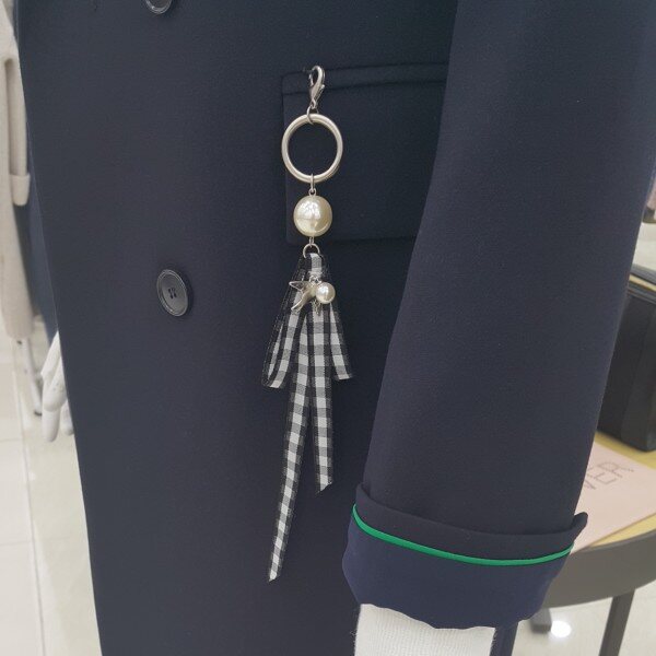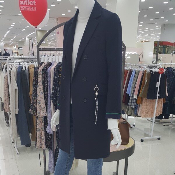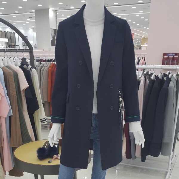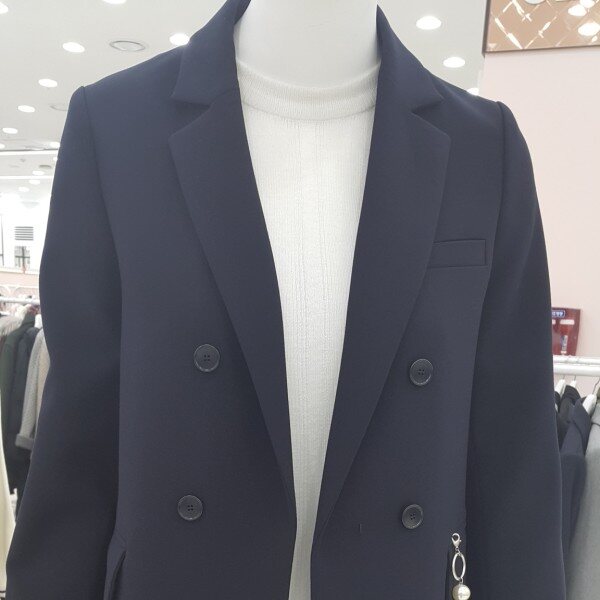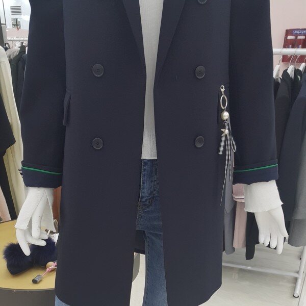 더블단추 싱글자켓이구요진주리본 장식이 멋스럽구요소매배색이상큼해요롱기장의 스마트한 디자인이예요.