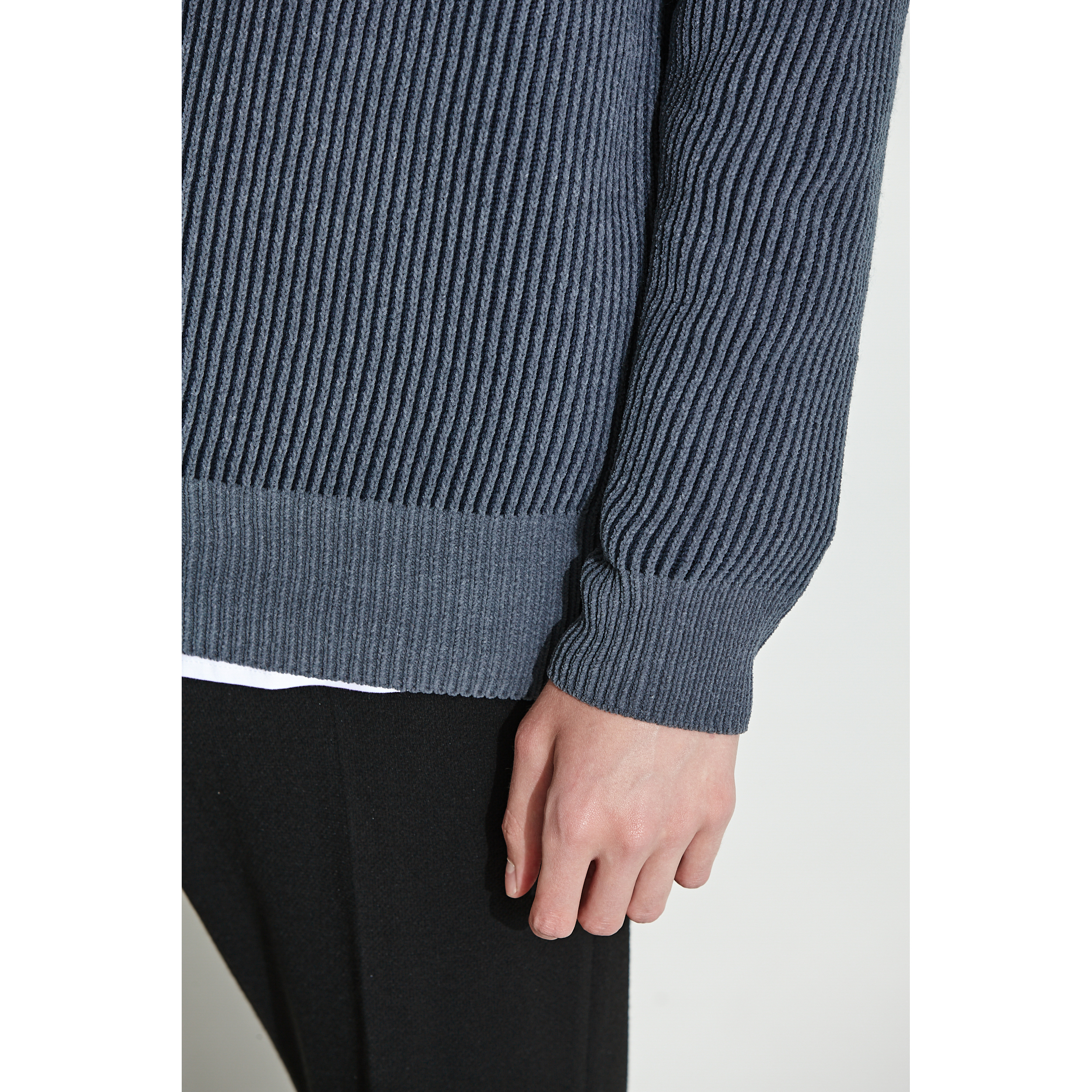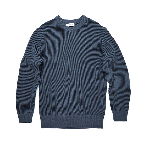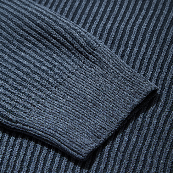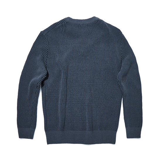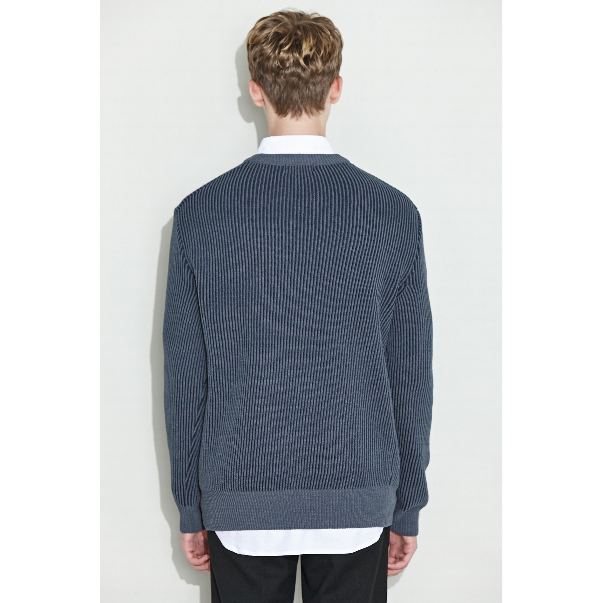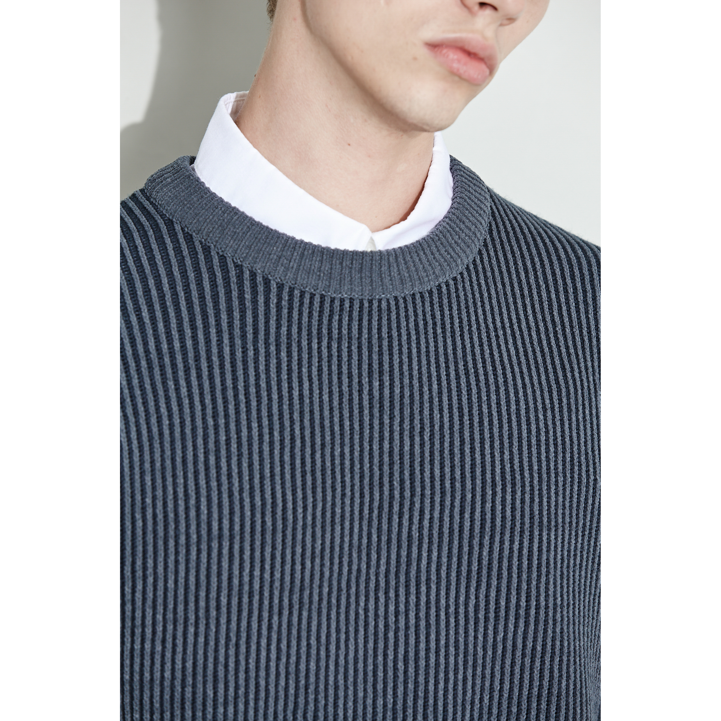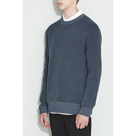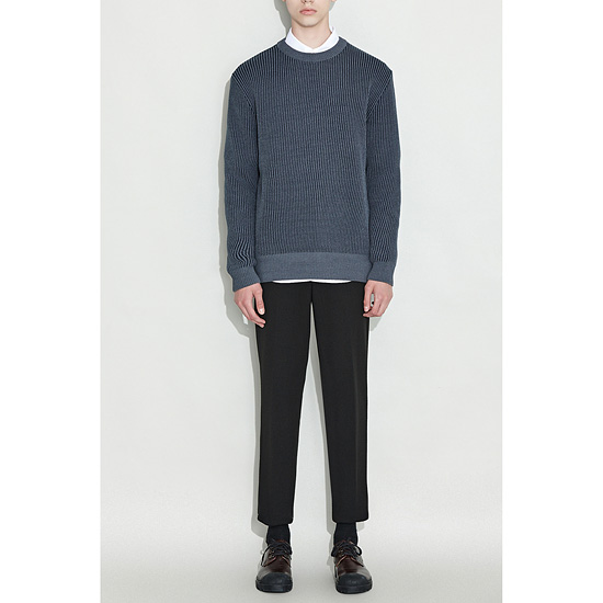 은은한 투톤 조직으로 편직한 남성 라운드 풀오버.