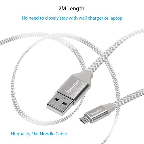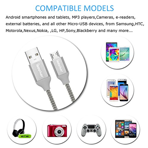 iSeeker Micro USB Cables,3 Pack 6.6ft Flat Cable High-speed Nylon Braided Charging Cable USB 2.0 A Male to Micro B Data Sync Charger Cable Cord with Metal Plug for Android, Samsung and More (Silver)