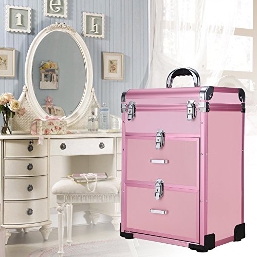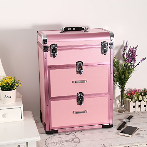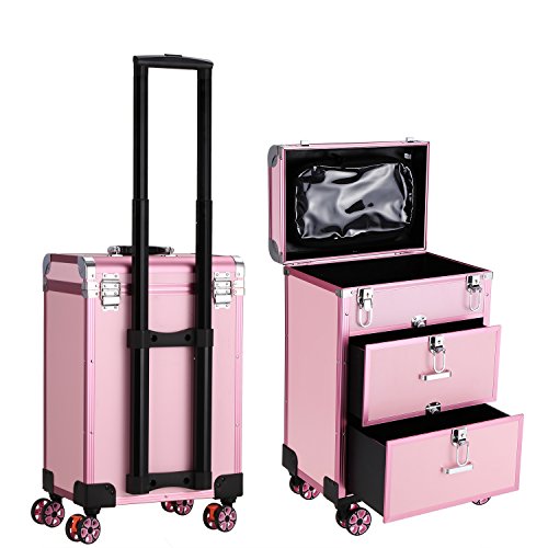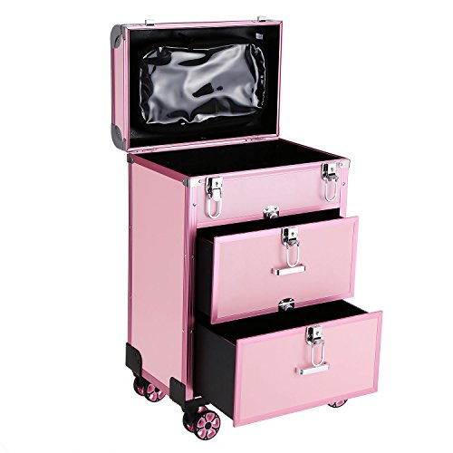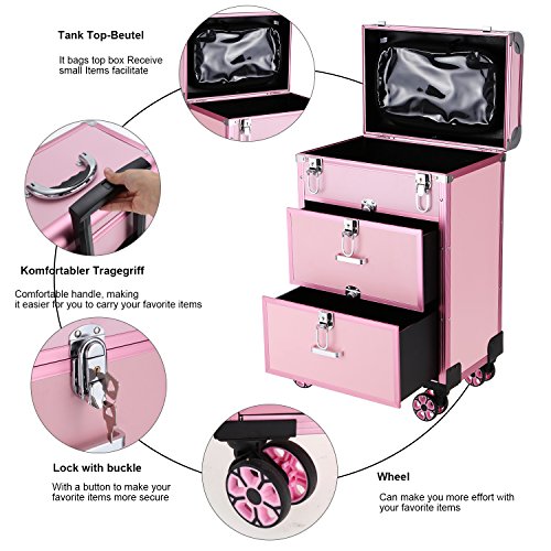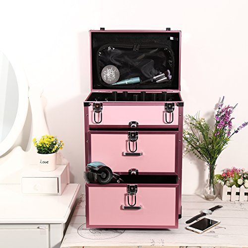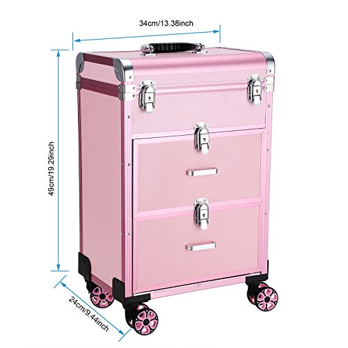 Dorfin Wheeled Cosmetic Train Case 3 in 1 Professional Multifunction Artist Trolley Aluminum Rolling Makeup Train Case Cosmetic Organizer Box with 4 Universal Wheels Pink