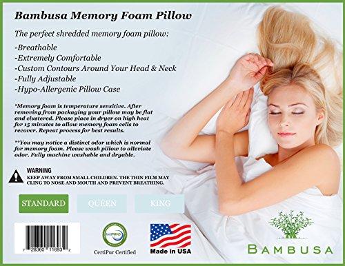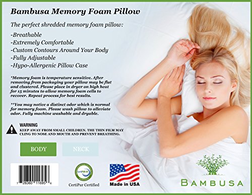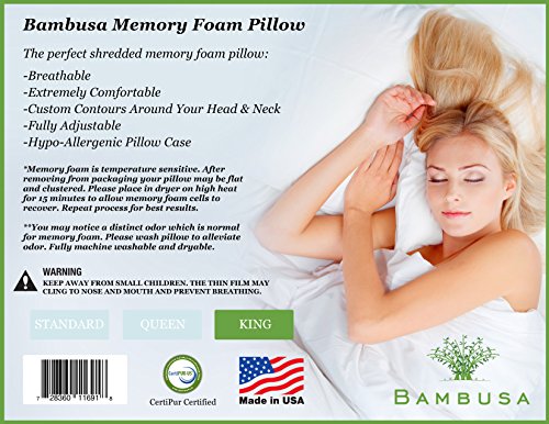 -. Feature : MADE IN USA PREMIUM LUXURY QUALITY: You can now get the highest quality memory foam pillow for a fraction of the cost. Bambusa is made 100% in the USA with the highest quality standards. / FULLY ADJUSTABLE PILLOW: Made with our proprietary mix of bio-degrable memory foam and cool activation technology allows ideal comfort and ventilation for the sleeper. / ECO-FRIENDLY: CertiPUR-US certified product. Bambusa pillows are made without ozone depleters, flame retardants, mercury, lead and heavy metals, formaldehyde, phthalates regulated by the CPSC, or CFC. Our pillows meet the CertiPUR-US standards for content, emissions and durability. / HYPOALLERGENIC & DUST MITE RESISTANT: With our patented Allershield you no longer have to sacrifice comfort. 100% machine washable for easy care. / 100% MONEY BACK GARUNTEE: If you are not 100% satisfied with your purchase. Please return the product for a no questions asked full refund.