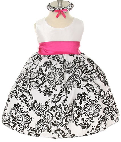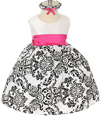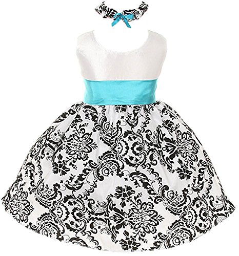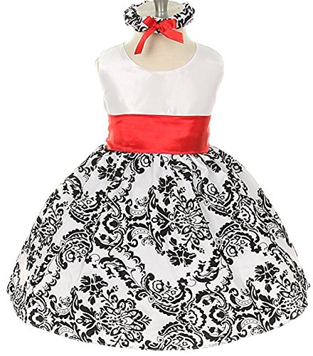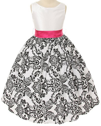 Baby and Girl Sizes to Match Sisters or Cute Family Photos! Beautifully fitted white satin bodice with zipper back and a bright colorful sash highlights the waistline. Taffeta skirt is flocked in a floral pattern with black velvet and is lined with netting for added fullness to the tea-length skirt. Long detachable sash included, can be tied at the back or put the bow in the front, and can be used for accessorizing other outfits or dresses. 100% Polyester. Hand wash. Made in the USAFeature