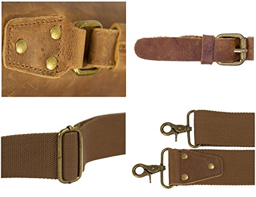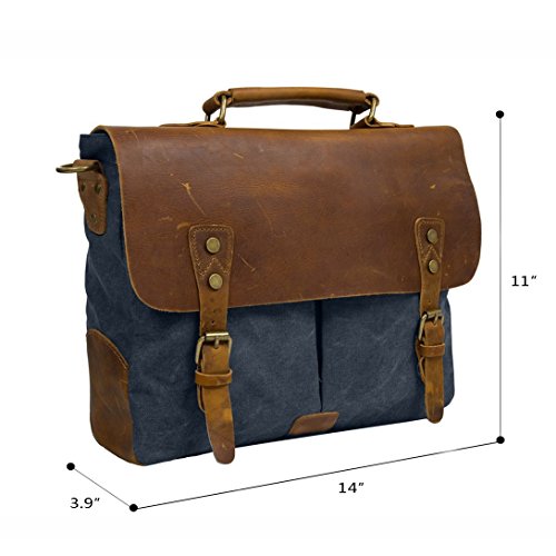 -. Feature : Material: Superior crazy horse leather + canvas + hardware.(the biggest feature of crazy horse leather is the surface is messy, disorderly, scratches,style: retro and wildness) / Size dimensions: 36 x 10 x 28cm / 14.2'' x 3.9'' x 11'' inches(H x W x L) / USAGES: shoulder / portable / crossbody / Structure: 1 main pocket, 1 hidden zipper pocket, 2 larger front pockets, and 2 inner wall pockets. / Capacity: Can put A4 magazine, 14 inch laptop, IPAD Tablet PC, mobile phone, book, etc.