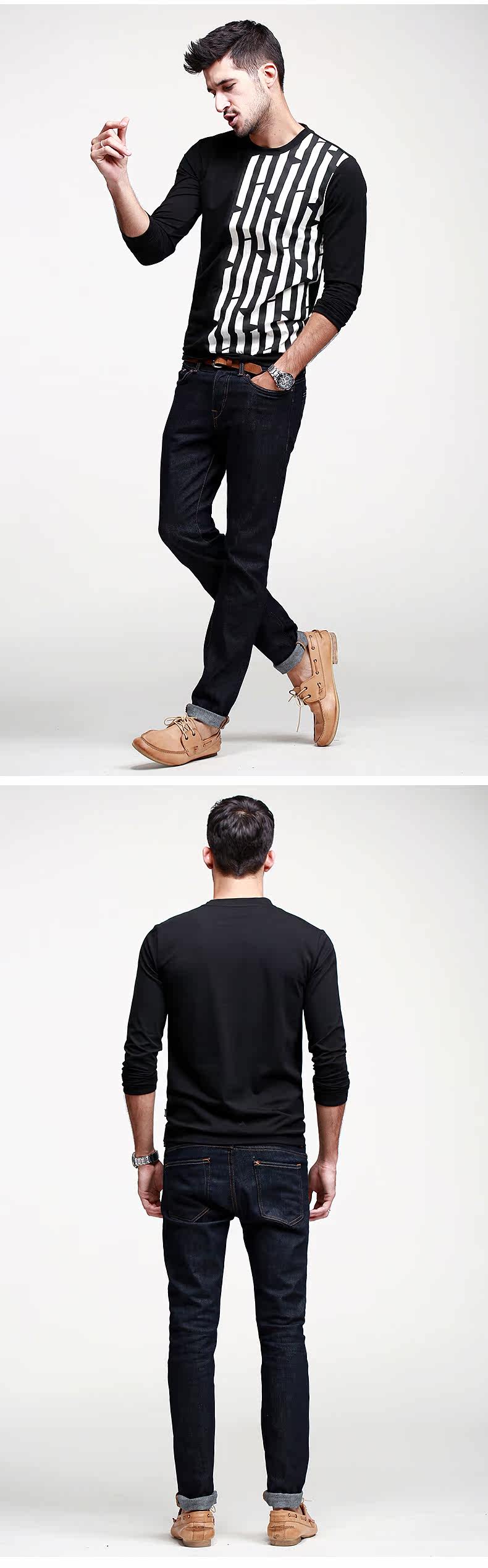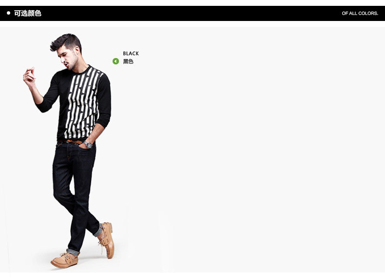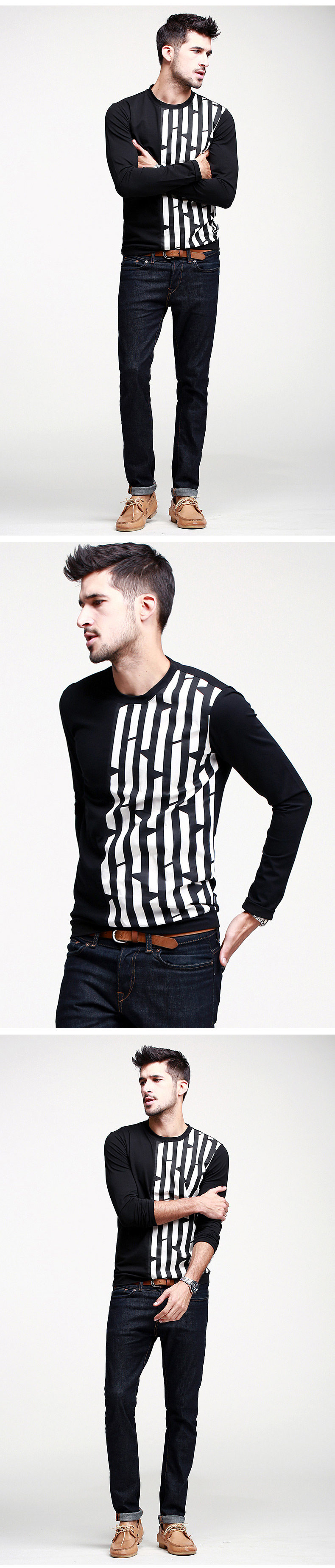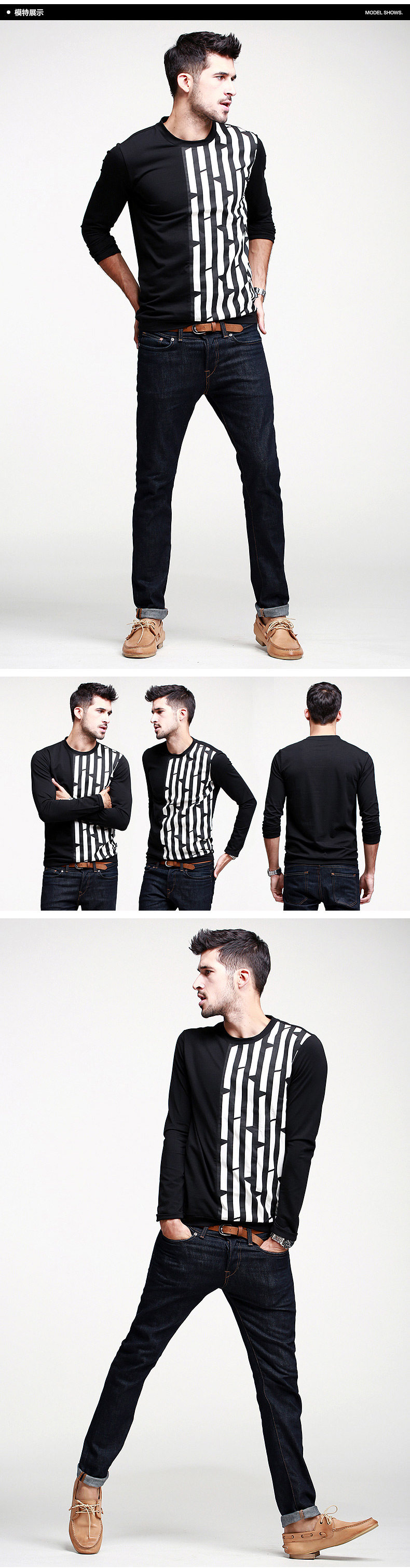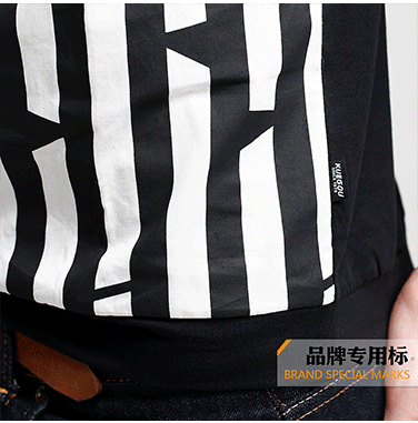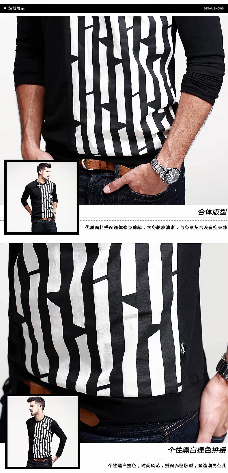 ②设计:黑白撞色条纹印花印染衣身,视觉新潮,合体版型+精准剪裁,完美勾勒身型线条,将男士锐意精练的个性淋漓展现!