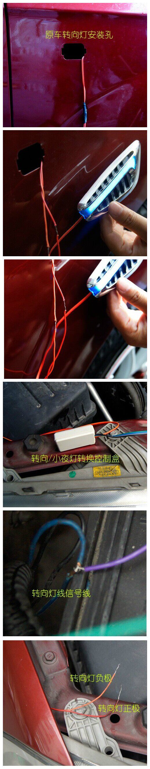This article describes the installation location in the body side panel of the leaves. Line connection according to the instructions, you can both steady and steering indicator, that is, when the night light will light turned dark blade turning, turning when hit, the corresponding side will blink