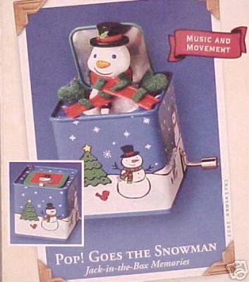 Hallmark Keepsake Ornament - Pop! Goes the Snowman - First in Jack-in-the-Box Memories Series 2003 (QX8457) - From back of ornament box: Victorian Era jack-in-the-boxes, which entertained children in the late 1800s, had faces that resembled puppets from popular Punch-and-Judy shows of the day. Earlier jack-in-the-boxes are also thought to have been similarly inspired -- in fact, some of the 16th-century playthings were called "Punch boxes". This series of Keepsake Ornaments will feature characters we know and love today. A different one will pop out of the box each year. This jolly snowman is delighted to be the first.