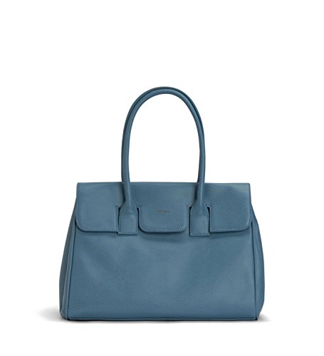 Shoulder bag that has a top flap closure with cutouts for handle. Magnetic snap closure as well as hidden magnetic closures on sides of flap. Two interior compartments separated by divider. Interior: zipper pocket, smartphone pocket, logo-embossed Dwell tag. 100% recycled nylon lining.