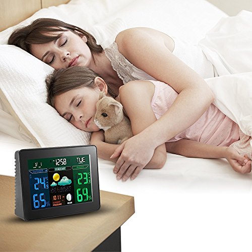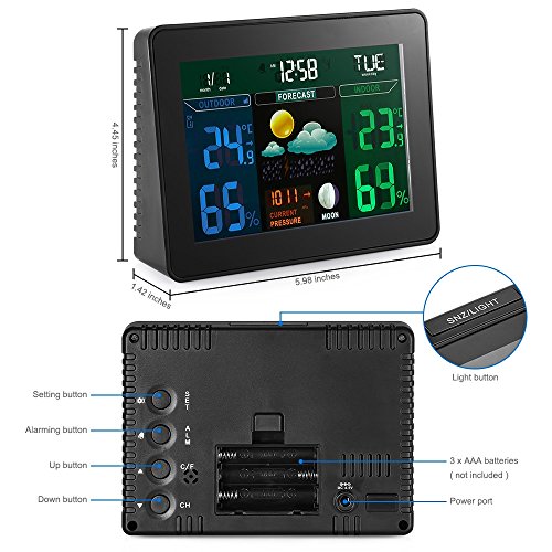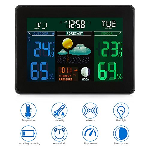 - [Alarm function and Numerous display information]you can use it as an alarm clock, which is good for time managing.the screen provides you time, date, weekday, moon phase, pressure, forecast weather, indoor and outdoor temperature and humidity, helping you prepare in advance