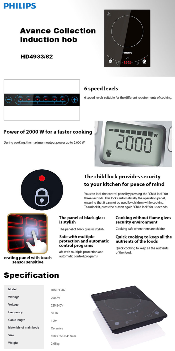 Philips HD4933 Avance Collection Induction cooker Sensor Touch 6 power levels 220V & Simple English User's Manual