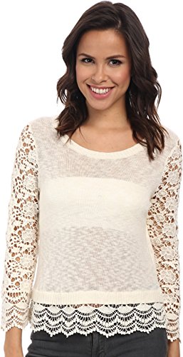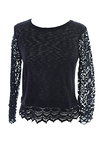 Add this knit sweater for an easy and effortless look. Pair with your jeans and flats to complete the look. Features lace sleeves and scalloped lace at hem.