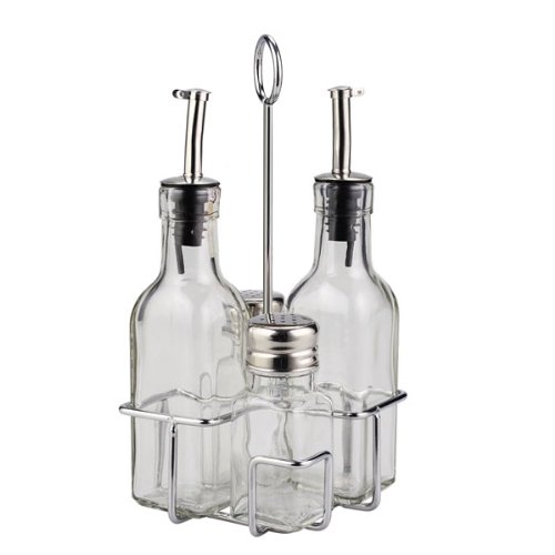 -. Feature : Set of 2 glass bottles and 2 shakers / Stainless steel spouts/Drip proof / 175 ml./6 oz. each bottle / Hand wash only / Wire caddy included