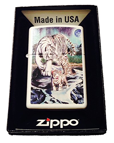 Zippo Custom Lighter - Celestial White Bengal Tigers & Cubs w/ Moon & Stars