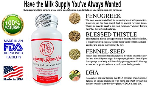 -. Feature : NATURAL LACTATION SUPPORT THAT WORKS: A safe and effective herbal lactation aid designed to quickly increase breast milk for breastfeeding mothers / QUICKLY PROMOTES NATURAL MILK PRODUCTION with Fenugreek Seed, Blessed Thistle Herb, Fennel Seeds plus DHA for healthy brain development / Custom formulated using only the highest quality sources of herbs, Mommy Knows Best lactating pills will help you to induce lactation in your body, quickly and naturally. / Mommy Knows Best Special Lactation Blend contains a whopping 2600 mg of tried and tested ingredients (in the proper amounts) that have been proven to work time and time again. / Produced in a GMP certified USA facility with rigorous safety standards for superior quality. This product does not contain any milk, dairy, egg, tree nuts, peanuts, wheat, or gluten