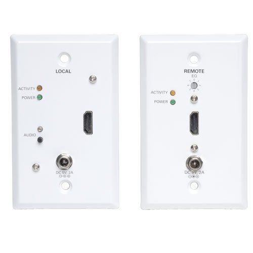 With Tripp Lites HDMI Over Cat5/Cat6 Wallplate Extender Kit, you can locate a HDMI enabled display up to 230 ft. away from the HDMI source, using 24Awg, Solid wire Cat5e/6 cabling. The kit consists of a Passive wallplate at the source side, and an Active wallplate (with built-in signal regenerator) at the display side. Simply run two Cat5/6 UTP cables between the two wallplates, and plug in standard Tripp Lite HDMI patch cables to the HDMI source and the display. The Green LED on the Display wallplate lets you know that power and a signal are coming from a connected source. The Red LED indicates only a signal is being received. The kit is functioning properly when the unit is connected to a display and the Green LED is lit. Both Digital Video annd Audio Signals are passed through. 1 Year Limited Warranty