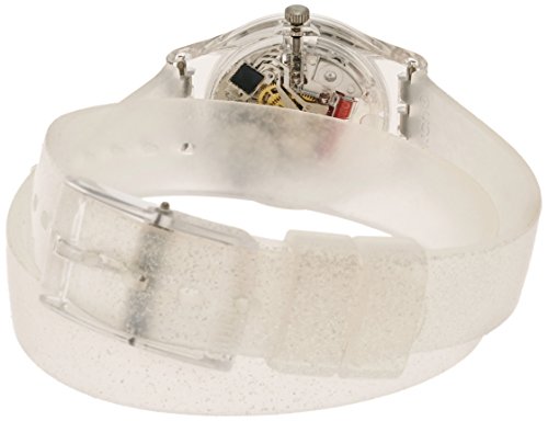 Transparent plastic case with a transparent silicone (double wrap) strap. Fixed transparent plastic bezel. Silver pearl dial with silver-tone hands and Arabic numeral hour markers. Dial Type: Analog. Quartz movement. Plastic crystal. Crystal plexi glass case back. Case diameter: 25 mm. Case thickness: 8 mm. Round case shape. Band width: 20 mm. Tang clasp. Casual watch style. Swatch Glistar Silver Pearl Dial Transaprent Double Wrap) Strap Ladies Watch LK343.Feature
