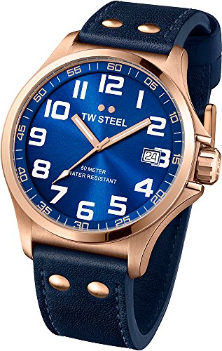 -. Title : TW Steel Pilot Sunray Blue Dial Rose Gold PVD Steel Blue Leather Mens Watch TW404
