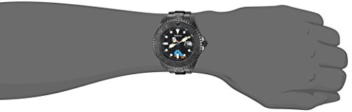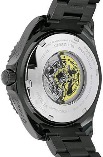 Invicta 24471 Character Collection Grand Diver men's automatic dive watch features a 47mm wide black ion plated solid stainless steel case with a unidirectional rotating bezel and textured screw down crown. Invicta 24471 is powered by a precise Japanese TMI NH35A automatic movement with 24 jewels. This stylish watch also features a shiny sunray Popeye printed black dial with beige accents black luminous hands and dot hour markers along with the date display function, scratch resistant mineral crystal and water resistant to 300 meters. Invicta 24471 is equipped with a 22mm wide black ion plated solid stainless steel bracelet with a fold over safety lock clasp. Invicta 24471 men's Character Grand Diver black dial black IP steel bracelet automatic dive watch is brand new and comes in an original Invicta gift box and is backed by a 5 year limited warranty.Feature