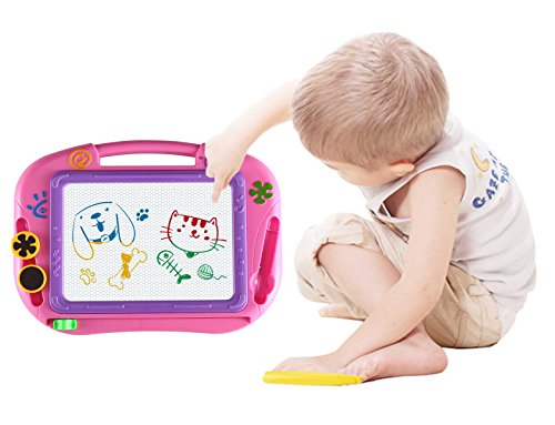 2 STAMPERS - Playing with our colorful doodle drawing board can inspire your kids' enthusiasm of writing, drawing and imagination. The magnetic pen create nice, solid lines without gaps when writing between the colors. This board including 2 snap fit shaped stampers and 1 pen specially designed to stay in place