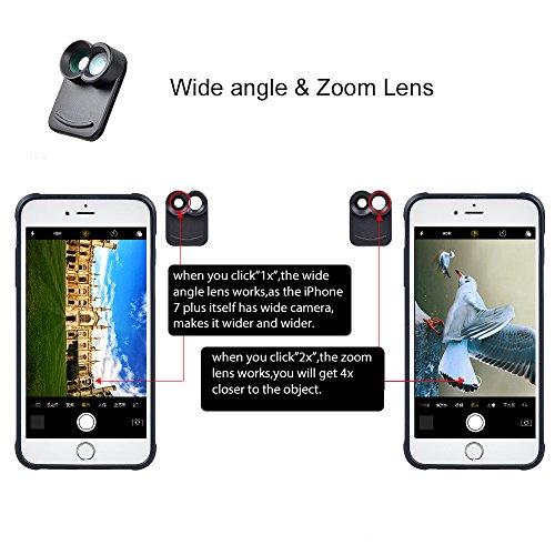 120°Wide Angle lens and 2X Telephoto Lens:Wide Angle lens easy for you to take pictures of large ranges and high clarity.Telescope Lens gets you twice as close to the subject, widely use for portraits, vacations, architectural, nature and landscape photography.
