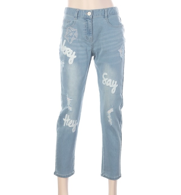 mesense, 이니셜 프린트로 캐주얼한 스타일 감각을 연출하는 데님 팬츠입니다