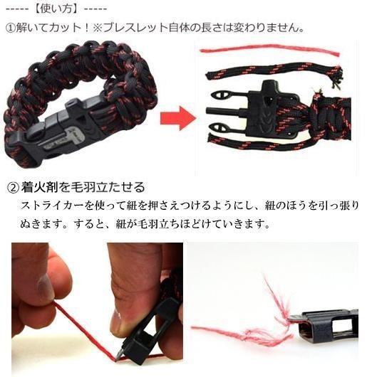 | ブレスレットの一部を解き外側部分を剥くと、中から可燃性の紐が出てきます。この可燃紐を燃やすことで緊急時に火種として使えます。火口が見つからなくとも火熾しができ、サバイバルはもちろん防災にも役立ちます。完全に解けば、およそ2.5~3m前後の一本のロープとなり、その耐荷重は250kgにおよびます。 |