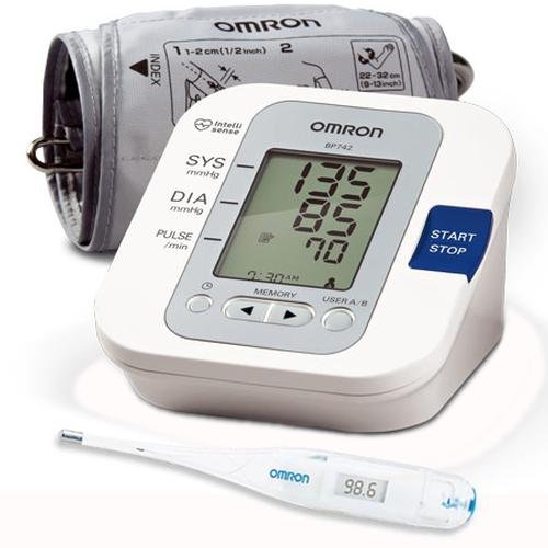 -. Brand : Omron -. EAN : 0045625007867 -. Feature : The Omron® 5 Series Upper Arm Blood Pressure Monitor (BP742) features a two user mode which allows two users to measure and track their readings separately in memory to better understand their changing blood pressure over time. / rregular Heartbeat Detection ? This monitor can detect irregular heartbeats while your blood pressure is being measured. If an irregular heartbeat is detected, an indicator icon will appear alerting you so you can consult with your medical professional. / Hypertension Indicator ? Alerts you if your blood pressure reading exceeds internationally recognized guidelines for normal home blood pressure levels / Includes Standard Adult Cuff 9in to 13in. Includes Omron MC-249 Thermometer. 2 Year limited warranty. / BP742 5 Series? Upper Arm Blood Pressure Monitor with Thermometer -. Label : Omron -. Manufacturer : Omron -. MPN : 71937 -. PackageQuantity : 1 -. PartNumber : 71937 -. ProductGroup : Beauty -. ProductTypeName : PERSONAL_CARE_APPLIANCE -. Publisher : Omron -. Studio : Omron -. Title : Omron BP742 5 Series Upper Arm Blood Pressure Monitor with Thermometer -. UPC : 045625007867