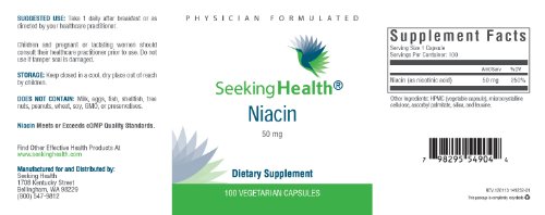-. Binding : Health and Beauty -. Brand : Seeking Health -. EAN : 0798295549044 -. Feature : IMPORTANT: Niacin is manufactured for and sold exclusively by Seeking Health. We DO NOT recommend purchasing this product from any supplier other than Seeking Health on Amazon.com. / Provides 50 mg of Niacin (as nicotinic acid) in an easy-to-swallow vegetarian capsule. / Promotes healthy skin and is important for energy production. May also support healthy mood and cognitive health. / Free of Magnesium Stearate. Non-GMO ingredients. / Physician Formulated. -. IsAdultProduct : 0 -. Label : Seeking Health -. Manufacturer : Seeking Health -. MPN : NIACIN-100-CAPS -. PartNumber : NIACIN-100-CAPS -. ProductGroup : Health and Beauty -. ProductTypeName : HEALTH_PERSONAL_CARE -. Publisher : Seeking Health -. Studio : Seeking Health -. Title : Niacin | Provides 50 mg of Niacin in an easy-to-swallow vegetarian capsule | Vitamin B3 | Free of Magnesium Stearate | 100 Vegetarian Capsules | Non-GMO | Physician Formulated | Seeking Health -. UPC : 798295549044