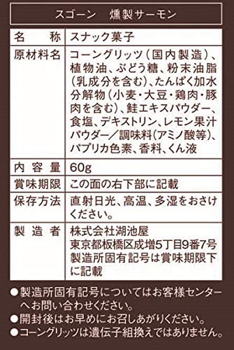 原材料:コーングリッツ(国内製造)、植物油、ぶどう糖、粉末油脂(乳成分を含む)、たんぱく加水分解物(小麦・大豆・鶏肉・豚肉を含む)、鮭エキスパウダー、食塩、デキストリン、レモン果汁パウダー/調味料(アミノ酸等)、パプリカ色素、香料、くん液