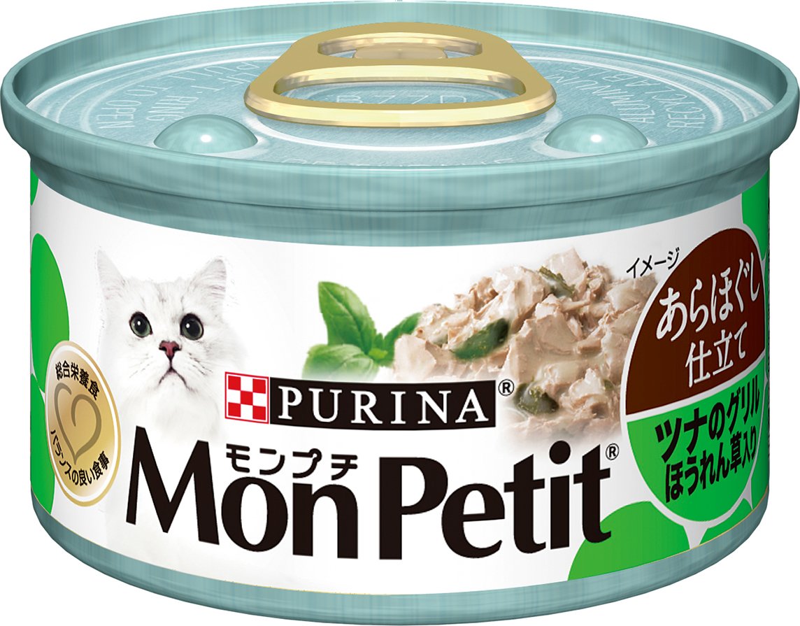 肉類(ポーク、チキン)、魚介類(ツナ)、穀類(小麦グルテン等)、豆類(大豆たんぱく)、野菜類(ほうれん草)、増粘安定剤(加工でんぷん)、ミネラル類、アミノ酸類、着色料(食用赤色3号、酸化チタン)、ビタミン類