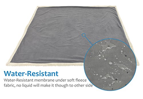 ?Reversible for two different textures. Plush micro fleece side is made of 100% waterproof fabric, plush Sherpa fleece on the other which is not waterproof but no liquid will make it through to the other side.