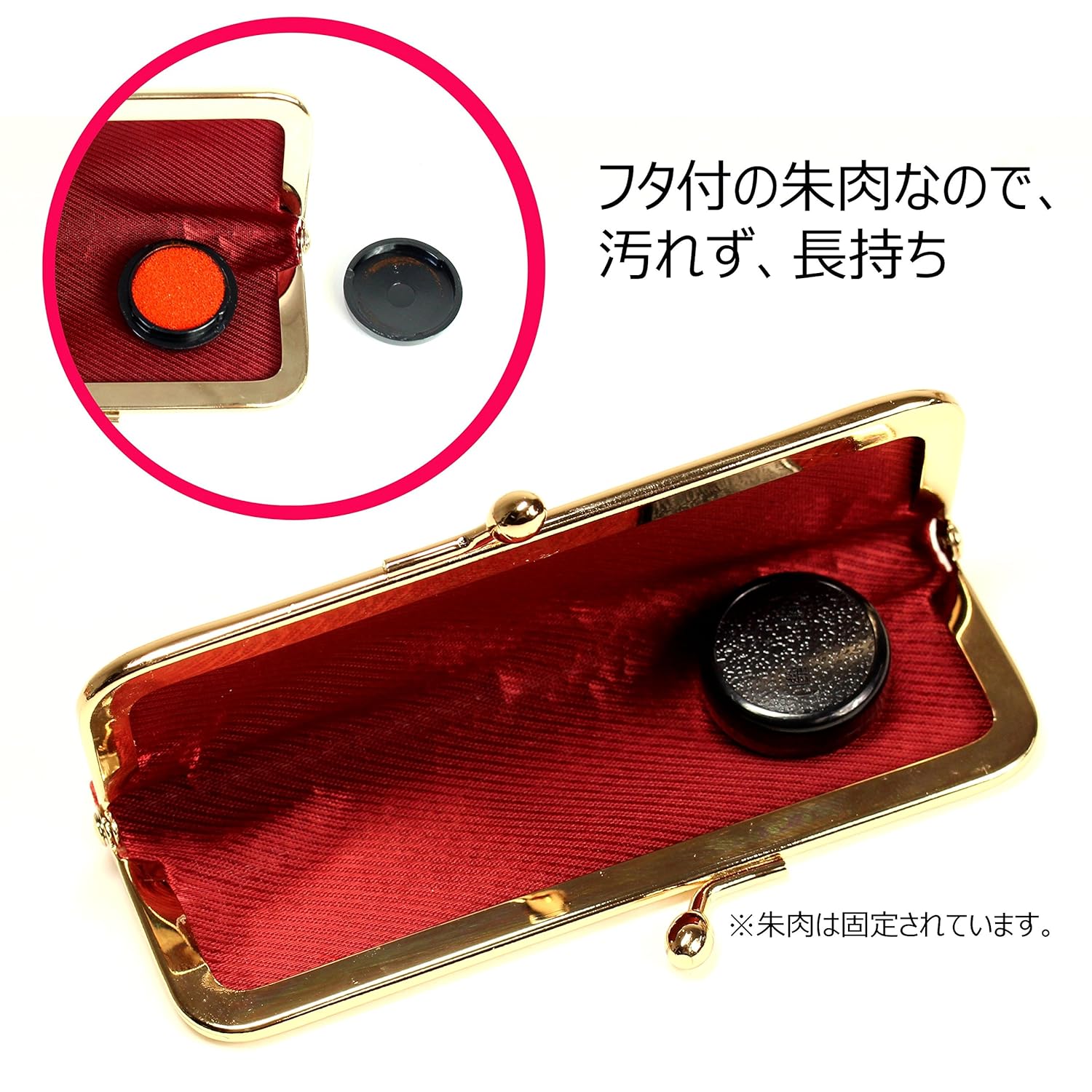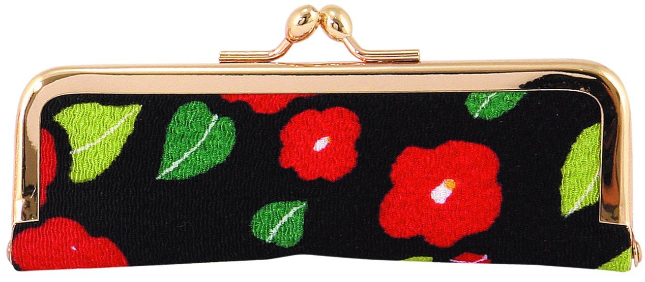 ちりめん生地を使用した柔らかな風合を持つ朱肉付き印鑑ケースです。 使いやすいがま口タイプなので、中の判子が取り出しやすく、朱肉も押しやすい設計となっています。 【サイズ】 約5x11.5mm 【素材】 表地:レーヨン、裏地:綿 / 【製造】 日本 【柄】 椿 黒