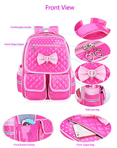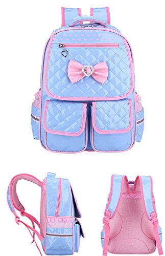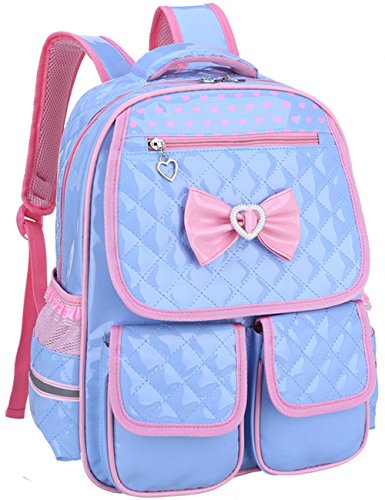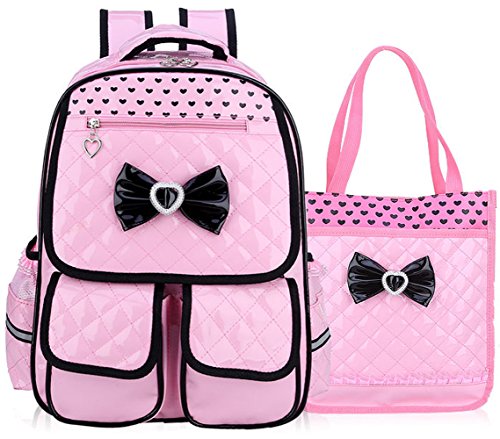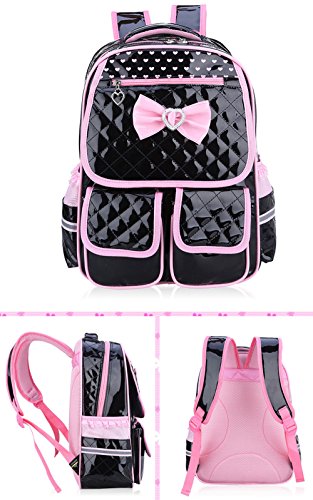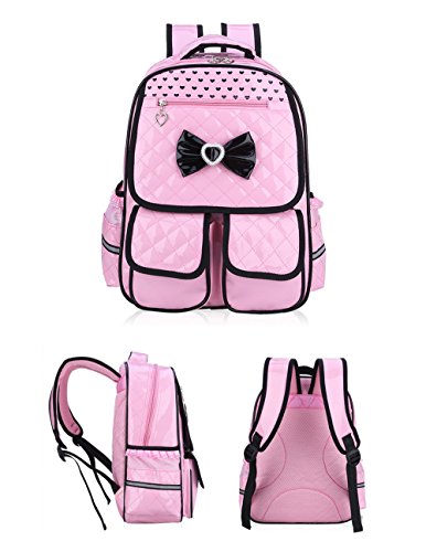 Product Description Gazigo PU Leather Backpack Bowknot Cute Book Bag Rucksack Casual Daypack Schoolbag for Elementary School Primary Girls Kids Shoulders Backpacks Back to School Gift Idea SCHOOL BACKPACK SPECIFICATION The compartments are well organized. The main inner with several pockets can put phone, wallet, notebooks, magazines, A4 files; other stationery. 1 Front Zipper Bag: store your small things, like wallet, keys,phone,etc. 2 Front Cover Band Porkets: Easily reach your pencil box,notebook,and other small School Suppliers 2 side pockets can hold a water bottle and umbrella. Lunch Bag/Picnic bag: One big front Zipper bag for Ipad, iphone, keys,exercise books ect. Main container inside can fit A4 paper and Books,umberlla,bottle,lunch box,etc. Sweet Girls School Backpack Dimension (Around 5-14 Years old): Backpack Small size: 14.9" x 11.4" x 5.1" (recommendation 1--3-grade) Backpack Large size: 16.9" x 11.8" x 7" (recommendation 4--6-grade) Material: PU Leather(Easy cleaning by dishcloth wiped when it soiled) Weight: Small-0.55KG/Large 0.7KG