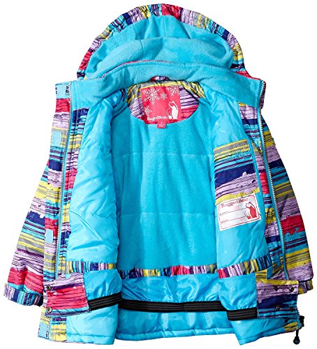 Two-piece set featuring solid-tone snow bib and striped coat with hood