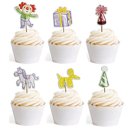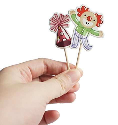 - ✈CIRCUS CUPCAKE TOPPERS PACKAGE: Each package includes 24 pcs of cupcake toppers, 6 styles in total (clown, gift, Balloon dog, horse, green Circus Hats, red Circus Hats), 4 pcs each. Length about 3.5 inches, topper about 2 x 2 inches.