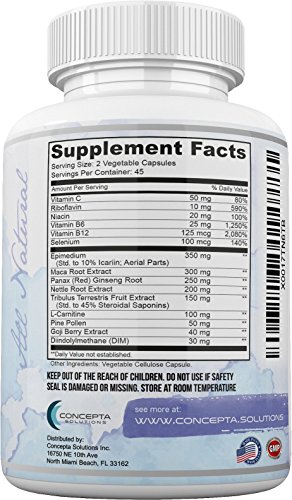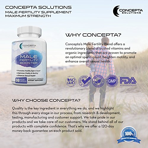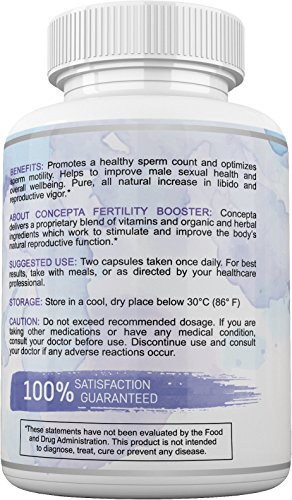 -. Feature : ✓ WHAT IS IT - Our winning formula promotes a healthy sperm count and optimizes sperm motility. Concepta helps to improve male sexual health and overall wellbeing. Pure, all natural increase in libido and reproductive vigor. Concepta delivers a proP.R.Ietary blend of vitamins, organic and herbal ingredients which work to stimulate and improve the body's natural reproductive function. / ✓ WHY CONCEPTA - Our scientifically balanced and synergistic formula provides over 1575 mg of vitamins, minerals, organic and herbal ingredients; many used for centuries in Traditional Chinese Medicine and Ayurvedic to overcome fertility issues and essential for fertility health. Simply put, the effect of each and every herb has been micro-calculated to provide maximum benefit while enhancing the whole. / ✓ COMPARE OUR LARGE 90 CAPSULE BOTTLE - 45 Day Supply! Unlike other supplements, Concepta leaves out the fillers and extraneous chemicals like magnesium stearate, using ONLY pure effective antioxidants and phytonutrients. Proudly made in America in an FDA-certified laboratory, meeting the highest cGMP industry standards for quality and purity, our supplements contain only active ingredients, nothing more. / ✓ NON-GMO and VEGAN FRIENDLY - Our proP.R.Ietary formula is made with body-friendly and proven natural phytonutrients for your comfort and safety. Three months is the baseline for creating real change when it comes to hormonal issues. For best results, continue using Concepta until conception is achieved. At the same time, cutting down on processed foods and having more whole-grain products, fruits, vegetables, and lean meats will contribute to lower blood glucose and normalize hormone levels. / ✓ 100% SATISFACTION GUARANTEED - We're so confident that Concepta's Fertility Booster will meet your satisfaction, we're talking all of the risk with our Satisfaction Guarantee! Try our trusted formula for 90 days - If you're not satisfied, just let us know & you will receive a full refund, no questions asked, no hassles!