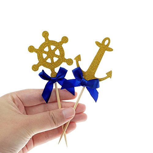 Shxstore Nautical Theme Cupcake Cake Toppers Picks Of Anchor Boat Rudder For Wedding Birthday Baby Shower Party Decor Supplies, 24 Counts