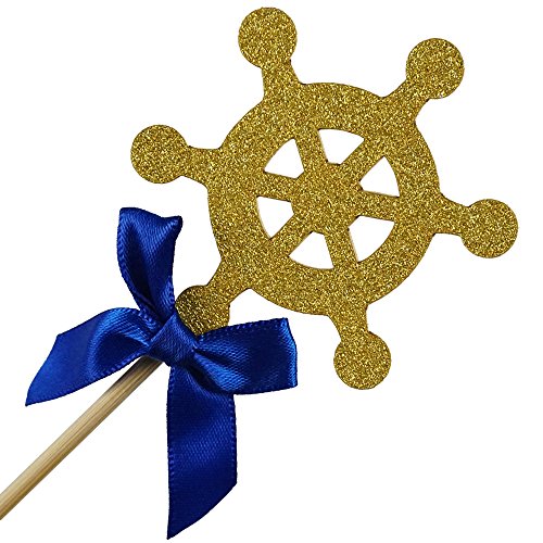 - Gold Nautical Theme Cupcake Cake Toppers: 3 different style of anchor cake topper, boat cake topper and rudder cake topper, with blue bows.