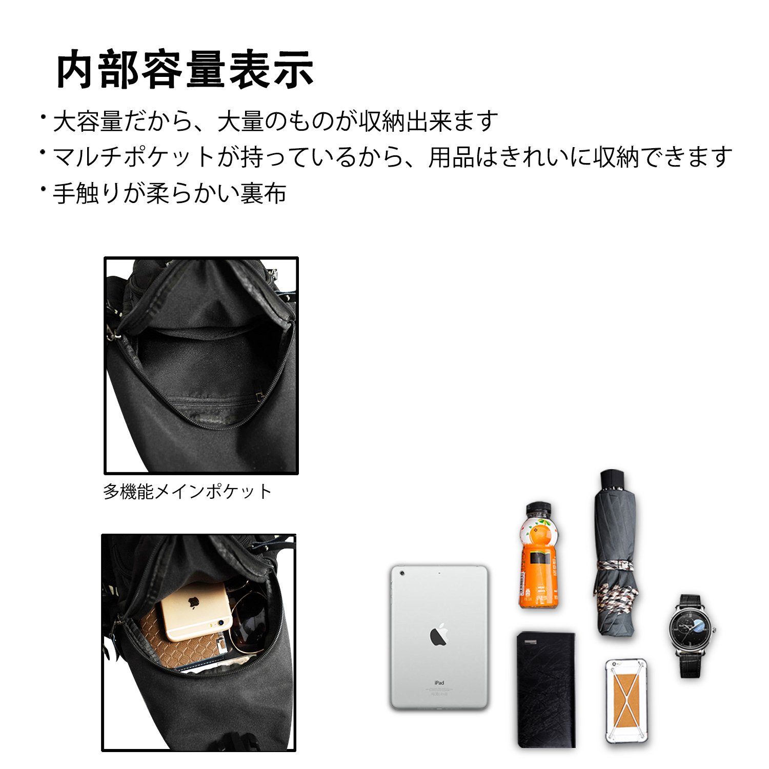Essential items such as umbrellas, glasses, wallets, keys, smartphones, mobile batteries and so on will fit properly.