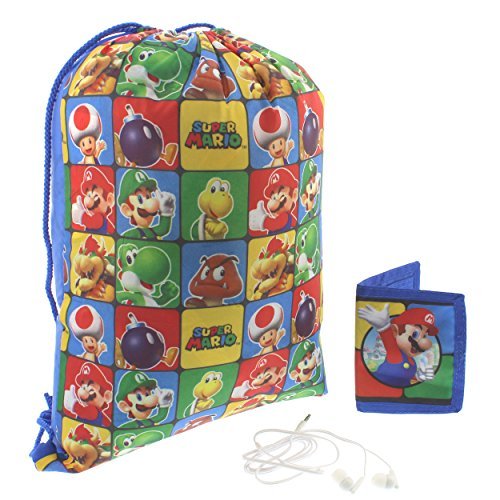 These awesome Super Mario 3 piece gift sets include a drawstring backpack, a set of headphones, and a wallet! These gift sets feature your favorite Nintendo Super Mario characters: Mario, Toad, Luigi, Bowser, Goomba, Koopa Troopa, Yoshi, and Bob-omb. The bi-fold wallet contains a hook and loop closure. Your child can easily carry books, gym clothes, school supplies, snacks, and more with these cool cinch sack bags! This gift set is perfect for any Super Mario, Mario Party, or Mario Kart fan, and they make a great stocking stuffer for the holidays!Feature