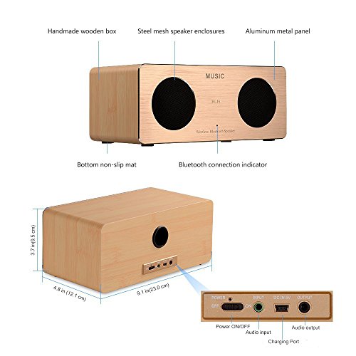 -. Feature : Super simple operation: In order to get a better sound and simple operation, this time we leave out all the function keys on the speakers. Only via bluetooth connection, you can freely control the speaker functions on mobile devices. Compared with the complex button Bluetooth Speaker on the market, it is easier for you / Feel the beat! Double 5W HD loud speakers and Enhanced BASS Resonator, combined with more than 60db SNR and passive subwoofer, delivers a qualified listening experience even CROSS A WALL and make it suitable for indoor and outdoor use. The most wonderful thing: with it, you can feel the effects of the cinema at home. / Built-in 2200mA Rechargeable Battery for up to 12 hours of playtime. Built-in high sensitivity microphone for hands-free speaker phone calling. Outstanding connection range of up to 33 feet. / Universal compatible with Android, iPhone, iPad, tablets, smartphones, iPods, MP3, MP4, radio players, and other Bluetooth enabled digital players; Equipped with a 3.5mm audio jack for non-Bluetooth devices. / The retro and elegant design, in classic simplicity, which fit to home fantastically, plus the sleek high-quality natural wood and aluminum panel cover reflex some shine in bright environment, offer you the beautiful enjoying not only for ears but also for eyes!