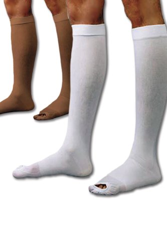 -. Feature : Open toe allows for easy toe inspection, and permits one size to fit a variety of foot lengths / Doctor-recommended, therapeutic graduated compression helps improve circulation, relieving minor variscosities and swelling. / Smooth, concealing opaque fabric for an attractive appearance, with a non-binding knit-in band at calf to keep securely in place. / Sold as a pair (two stockings). Available in beige or white. / For sizing measure circumference of ankle and calf: [ S: <12"] [M: 12-15"] [L: 15-17"][XL: 17"+]