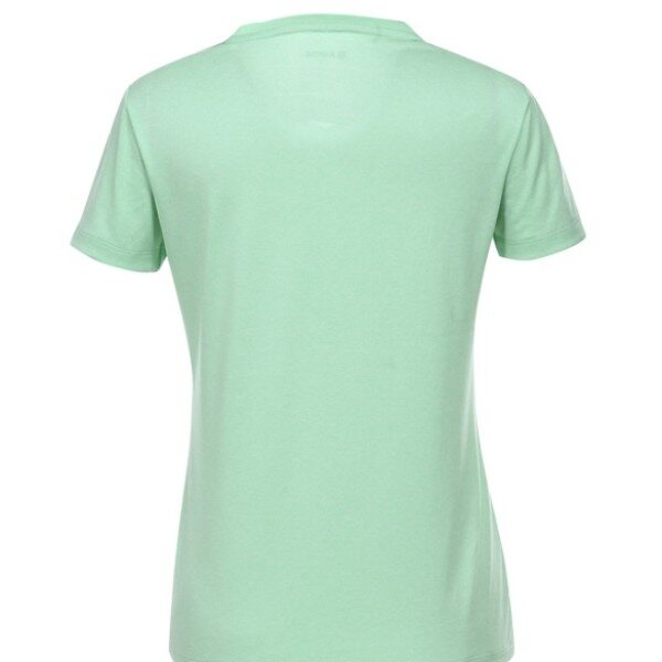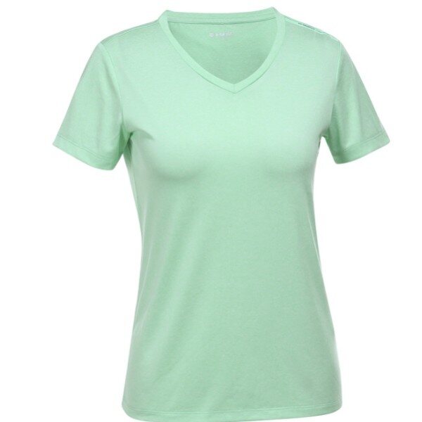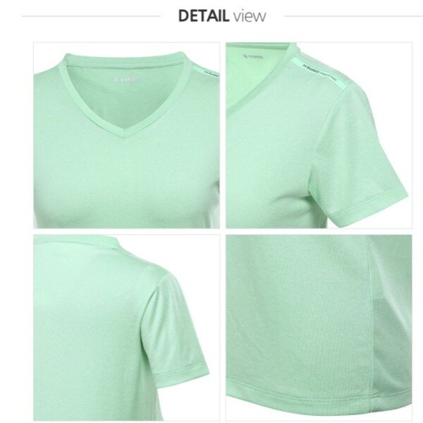 흡습속건이 우수한 멜란지폴리싱글 100%(Q-XDRY)의 소재를 사용한 제품. 어깨부분에 전사 프린트로 포인트를 줌. 폴리 싱글 여성 기본 V넥 반팔 티셔츠.