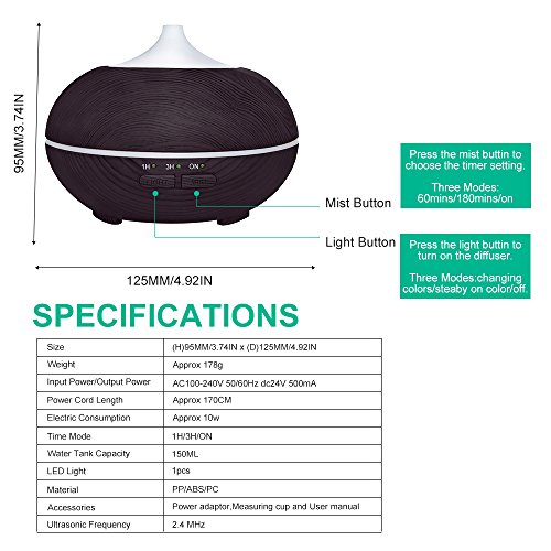 Large 150ml water capacity,ultrasonic vibrations turn the water and oil into an ultrafine scented mist that refreshes rooms up to 269 sq. ft. Runs continuously for3-5hours