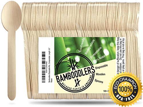 Disposable Wooden Spoons by Bamboodlers | 100% All-Natural, Eco-Friendly, Biodegradable, and Compostable - Because Earth is Awesome! Pack of 100- 6.5” spoons.
