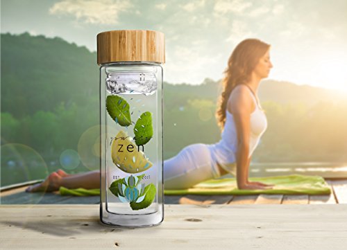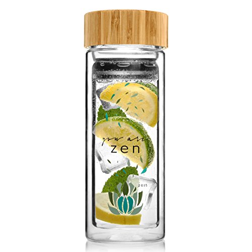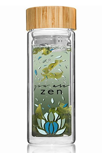 YOU ARE ZEN Tea Tumbler & Glass Water Bottle - Unique Stainless Steel Filter / Infuser - Premium Quality - BPA-Free - Bamboo Lid - Travel size 12 oz - For Loose leaf Tea, Teatox, Fruit and Detox