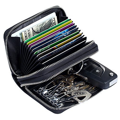-. Feature : Compact Size: 4.5" x 3.5" x 1.5" (11.5cm x 8.5cm x 3.8cm); About 5 ounces / 10 credit card slots, 6 metal hooks for home keys, 1 removable key ring for car key fob / RFID blocking lining protect your cards from unexpected scanning / Genuine cowhide leather, Polyester lining; Heavy-duty metal zipper, smooth and durable / 2 in 1 design, organizes credit cards, coins, cash, keys, card key fob in 1 compact wallet.