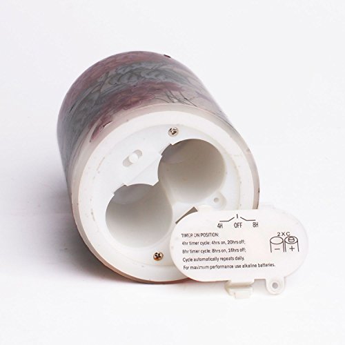 1.SPECIFICATIONS - -Candle size 3 inches Diam x 4 inches Height. Package of 1 . Candle runs on 2x C batteries (not included) .Features 4H-Off-8H switch. Made with real high quality wax and glass.
