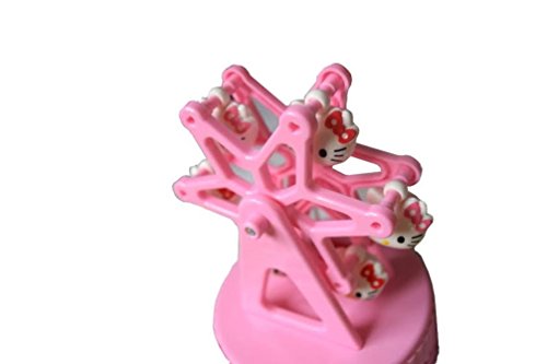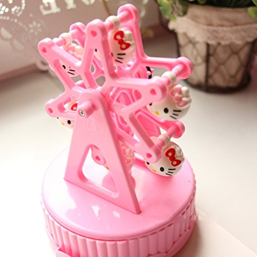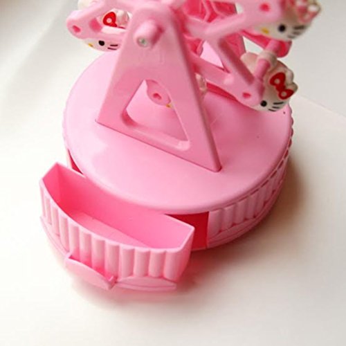 Feature : No Batteries Needed Easy Wind up / Carousel Turns around As Music Plays / Size 4.5 Inches Diameter 6 Inches Tall / Pull Drawer Open To Play Music Closed-Drawer Music Stops / Hello Kitty Style Jewelry Box