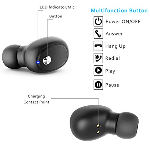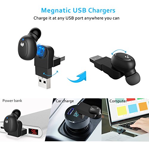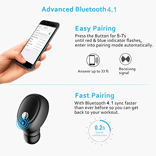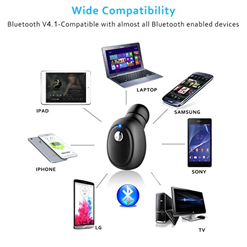 -. Feature : Smallest & Ergonomic Design: Only 3g, lighter than a one-dollar coin; One-button design, comes with S/M/L ear-tips with anti-shedding features that secure fit different people; Ideal for calling or listening music in the car driving, meeting, or sports gym, totally release your hands. / Powerful Battery: So Small, so powerful! Embedded 40mAH lithium-ion battery of premium quality lets you listen audio (in 60% Volume) or phone calls up to 3 hours , on a full charge around 1-2 hours; Support IOS DEVICE POWER DISPLAY. / Bluetooth 4.1+EDR Technology: Compatible with all Bluetooth-enabled devices; Connecting with 2 Bluetooth devices at the same time; Instantly connect to your iPhone 7, Samsung, or LG V20 android and tablets devices from up to 33ft away. / Clear and Crisp Sound: HD microphone with acoustic echo cancellation allows you to make clear calls, perfect in enclosed spaces; Seamlessly switch between incoming voice calls and music; More convenient for listening to audio books , Pod casts and movies. / Magnetic Inductive Charging: Never have to fiddle with cords, just put it with any USB port device to charge and pick it up when you are ready to go, really easy for handle. No cable or plug needed.